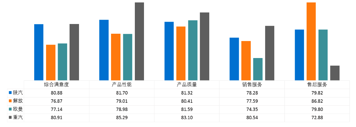 在全國(guó)專用市場(chǎng)中,四大品牌的顧客滿意度測(cè)評(píng)指數(shù)可劃分兩個(gè)梯隊(duì):