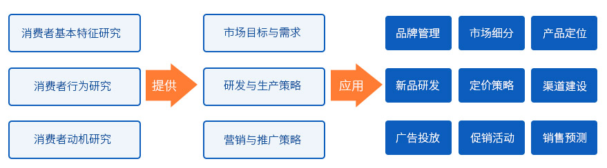 消費(fèi)者研究是市場(chǎng)調(diào)研領(lǐng)域應(yīng)用最多的消費(fèi)品市場(chǎng)研究的一個(gè)最基礎(chǔ)、主要的組成部分,包括消費(fèi)者基本特征研究、消費(fèi)者行為研究、消費(fèi)者動(dòng)機(jī)研究三大部分。通過(guò)這三個(gè)層面的研究,為相關(guān)行業(yè)和企業(yè)提供:市場(chǎng)細(xì)分、產(chǎn)品定位、品牌管理、定價(jià)策略、新品開(kāi)發(fā)、渠道建設(shè)、廣告投放、促銷活動(dòng)、銷售預(yù)測(cè)等行為的理論、數(shù)據(jù)基礎(chǔ)。