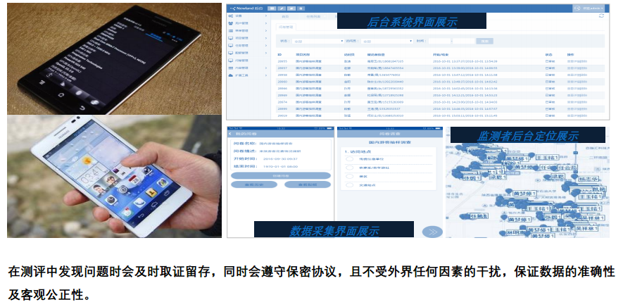 公司有著自主研發的數據采集系統,以智能手機或平板電腦為載體,事先將制定指標體系從系統后臺導入,執行過程中的問題記錄是通過觸摸屏直接記錄,并傳送到系統終端,實現數據時時記錄時時上傳,系統后臺可觀測到監測者的實時定位,從多種方面保證了數據的真實有效性。此系統的八大特點:
